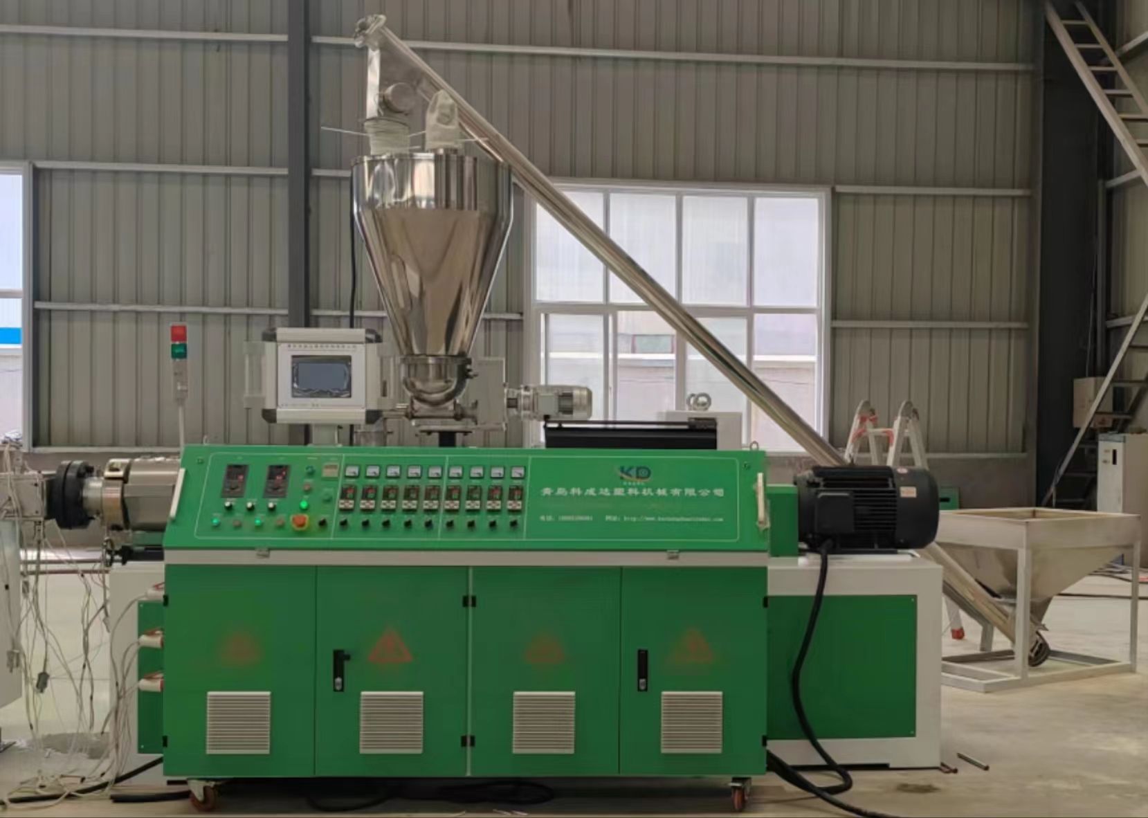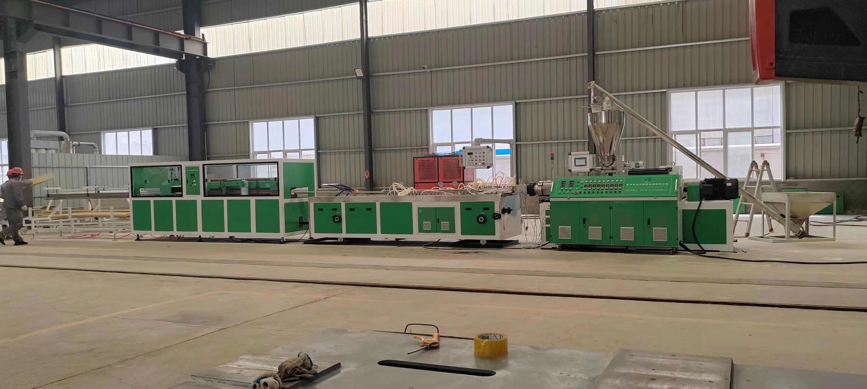 錐形雙螺桿擠出機,模具,定型臺,牽引機,切割機,堆料架。配套輔機:混料機,覆膜機。